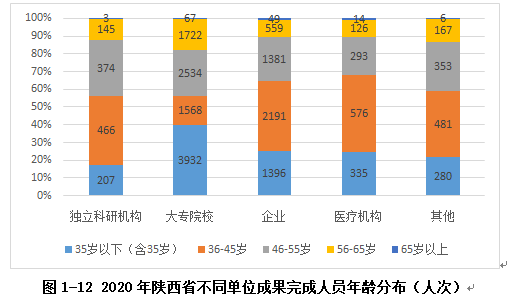 独立科研机构、企业、医疗机构和其他类型单位中成果完成人员均是36-45岁人员占比最高。而大专院校以35岁以下(含35岁)人员占比最高,为40.03%(图1-12)。