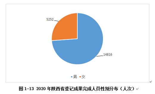 从2020年登记的科技成果人员性别结构来看,男性的数量约女性的四倍。其中,男性15903人,占总人数的78.51%;女性4132人,占21.49%(图1-13)。