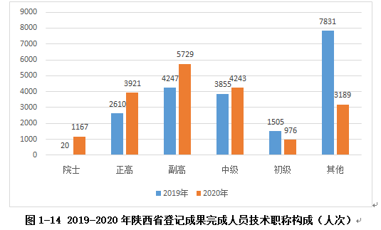 从2020年登记的科技成果人员技术职称结构来看,以正高、副高及中级技术职称研究人员为主。其中,院士1167人次,占全部人数的6.07%,较2019年的20人次增幅较大,增长了五十倍以上;正高级技术职称3921人次,占20.40%;副高级技术职称5729人次,占29.80%;中级技术职称4243人次,占3855%;初级技术职称976人次,占5.08%;其他研究人员3189人次,占16.59%。与2019年相比,具有中级及以上职称的研究人员均有所增加(图1-14)。