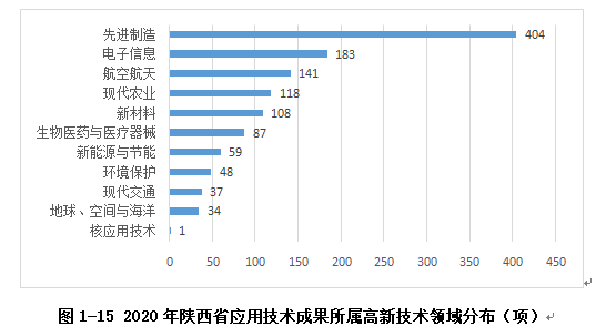 2020年陕西省登记的应用技术成果中有1220项涉及11大高新技术领域,其中先进制造领域404项,占高新技术领域成果总数的33.11%;电子信息183项,占15.00%;航空航天141项,占11.56%;现代农业118项,占9.67%;新材料108项,占8.85%;生物医药与医疗器械87项,占7.13%;新能源与节能59项,占4.84%;环境保48项,占3.93%;现代交通37项,占3.03%;地球、空间与海洋34项,占2.79%;核应用技术1项,占0.08%(图1-15)。