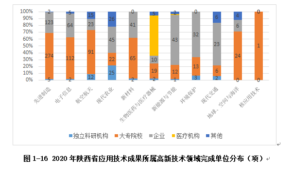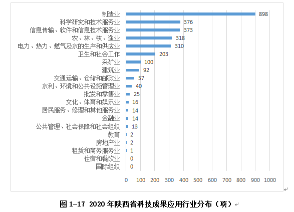 其中,应用于制造业的成果有898项,占31.46%,较2019年的605项增长了48.43%;科学研究和技术服务业376项,占13.17%;信息传输、软件和信息技术服务业373项,占13.07%;农、林、牧、渔业318项,占11.14%;电力、热力、燃气及水的生产和供应业310项,占10.86%;卫生和社会工作203项,占7.11%。特别的,在主要应用行业中,住宿和餐饮业、教育、信息传输、软件和信息技术服务业、水利、环境和公共设施管理业、交通运输、仓储和邮政业较2019年有所下降以外,其他各类行业的应用技术成果数较2019年均有不同幅度的增加。
