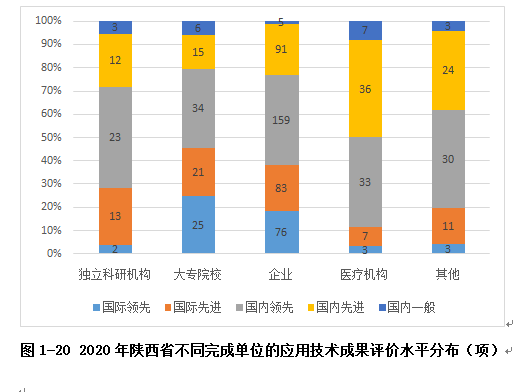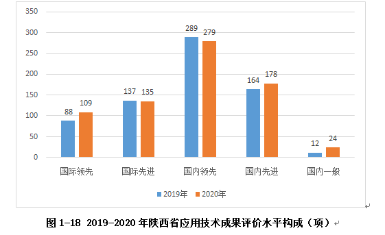 2020年陕西省登记的应用技术成果中,725项成果已进行评价,国际领先109项,占成果水平评价总数的15.03%,较2019年的88项增加了23.86%;国际先进135项,占18.62%;国内领先279项,占38.48%;国内先进178项,占24.55%;国内一般24项,占3.31%。其中,国内领先及以上水平的应用技术成果占比之和为72.1475%,与2019年的74.49%相比基本保持持平(图1-18)。