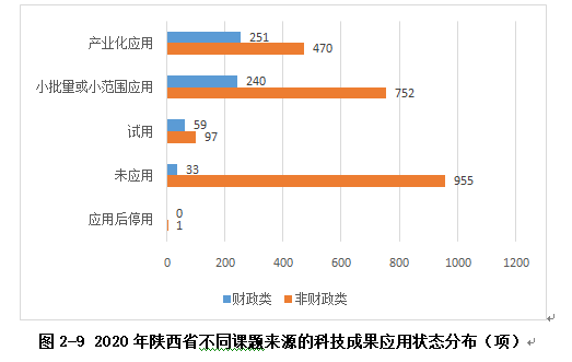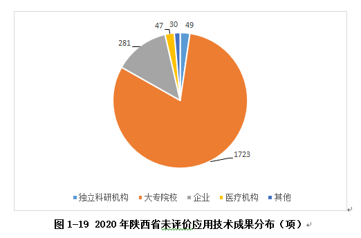 在2020年陕西省登记的科技成果中,正在应用的科技成果(包括试用、小批量或小范围应用、产业化应用)之和为1870项,占比65.43%,未应用的科技成果(包括应用后停用和未应用)为988项,占34.57%。