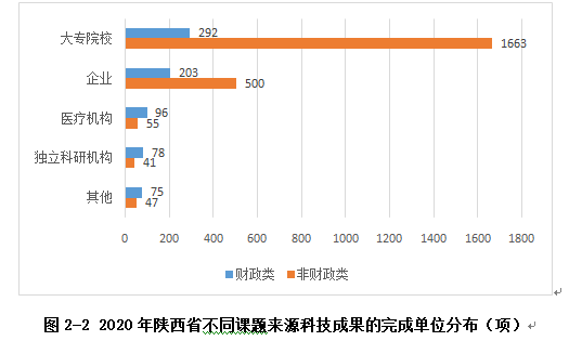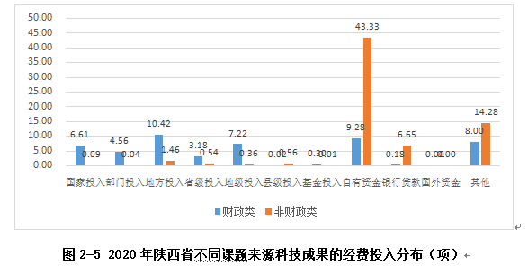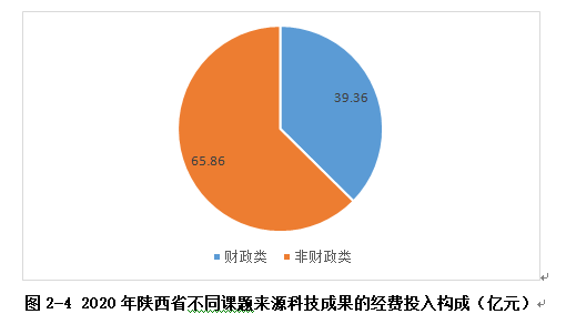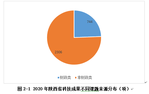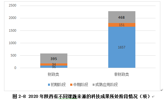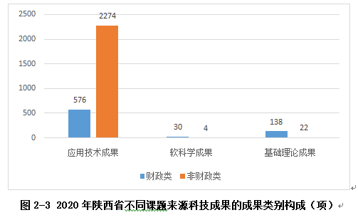 从图2-8可以看出,在2020年陕西省登记的科技成果中,财政类科技成果数量约占2020年陕西省登记的科技成果总数的三分之一,非财政类科技成果约占三分之二。