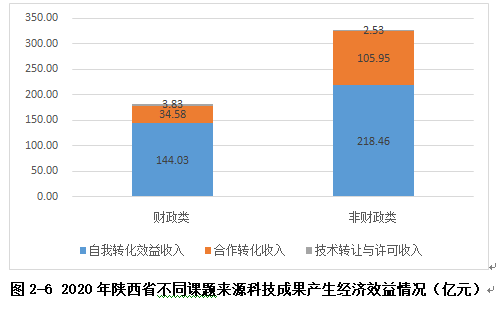 2020年陕西省登记的3050项科技成果中,有311项产生了经济效益,占总量的10.20%,科技成果总收入共509.38亿元。其中,财政类科技成果产生了182.45亿元经济效益,占经济效益总量的35.82%;非财政类科技成果产生了326.94亿元经济效益,占64.18%。