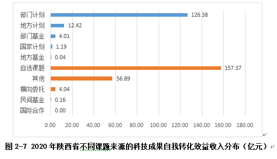 特别的,对于自我转化效益收入,课题来源为自选课题的科技成果产生的经济效益最多,157.37亿元,占自我转化效益总收入的43.41%;其次是部门计划,为126.38亿元,占34.86%;地方计划为12.42亿元,占3.43%;横向委托为4.04,占1.11%;部门基金为4.01亿元,占1.11%(图2-7)。