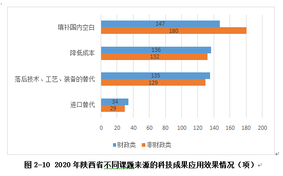 由图2-10可以看出,2020年应用后的科技成果已产生的实际效果中,无论财政类科技成果还是非财政类科技成果,均以填补国内空白、降低成本以及替代落后技术、工艺、装备为主。