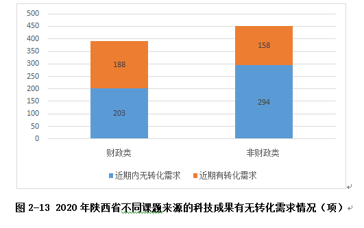 在2020年陕西省登记的科技成果中,对于财政类科技成果,有51.92%的成果近期内无转化需求,48.08%的成果近期有转化需求;对于非财政类科技成果,有65.04%的成果近期内无转化需求,34.96%的成果近期有转化需求(图2-13)。(此处近期指成果登记日的近期)