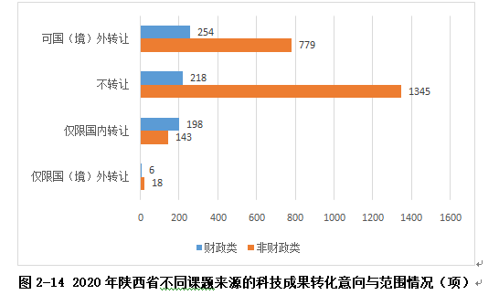对于非财政类科技成果,有1345项成果不转让,占非财政类科技成果总数的58.86%;可国(境)外转让有779项,占34.09%;仅限国内转让有143项,6.26%;仅限国(境)外转让有18项,占0.79%(图2-14)。