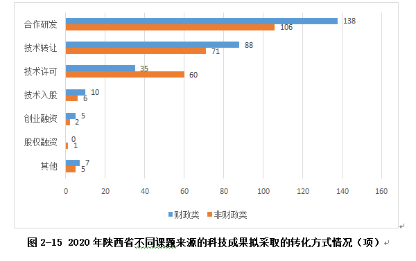 其中,对于财政类科技成果,合作研发138项,占财政类科技成果总数的48.76%;技术转让88项,占31.10%;技术许可35项,占12.37%;技术入股10项;占3.53%;创业融资5项,占1.77%;股权融资0项;其他转化方式7项,占2.47%。