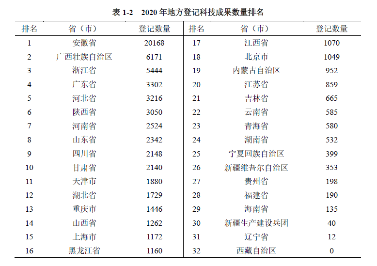 地方登记科技成果共70063项,占全国登记科技成果总量的91.56%,同比增长13.86%。安徽省、广西壮族自治区、浙江省等地方登记成果数量居地方登记省份前列(见表1-2)。