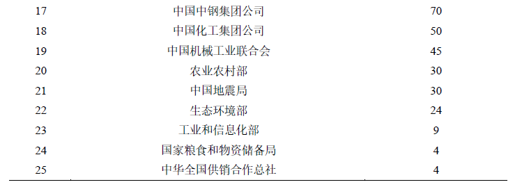 国务院有关部门、行业协会、中央企业登记科技成果数量为6458项(2019年7028项),同比下降8.11%,占全国登记科技成果总量的8.44%。中国石油天然气集团公司、中国科学院、自然资源部等部门的登记成果数量居部门登记单位前列(见表1-3)。