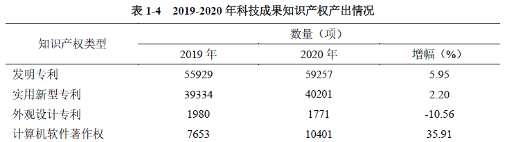 全国登记科技成果质量逐年提升。76521项登记的科技成果共产出知识产权120387项,同比增长6.49%。其中,已授权专利100446项,同比增长4.12%(见表1-4)。