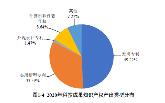 从知识产权类型看,发明专利和实用新型专利为主要类型,分别占知识产权总量的49.22%和33.39%(见图1-4)。计算机软件著作权数量显著增加,同比增长35.91%。
