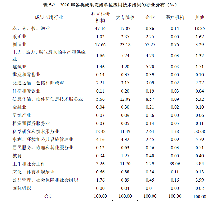 各类成果完成单位的应用技术成果所属行业中,独立科研机构侧重于农、林、牧、渔业,制造业和科学研究及技术服务业,占比分别为47.16%、17.66%和12.48%;大专院校侧重于制造业,农、林、牧、渔业,信息传输、软件和信息技术服务业及卫生和社会工作,占比分别为23.18%、17.07%、12.08%和11.70%;企业侧重于制造业,占比为57.27%;医疗机构以卫生和社会工作为主,占比为89.06%(见表5-2)。