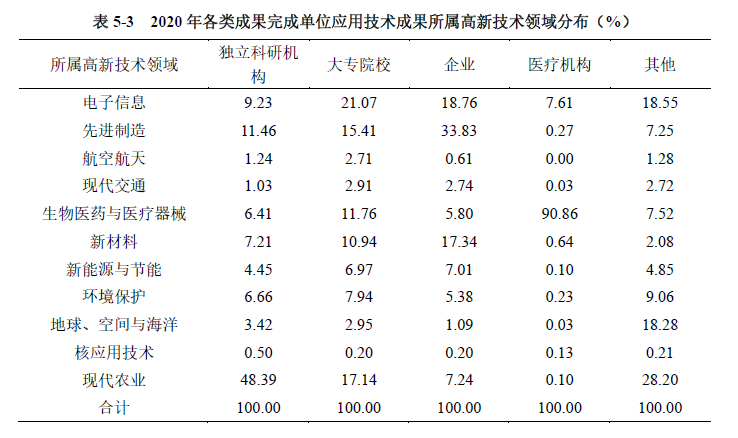 各类单位应用技术成果的高新技术领域分布较为分散。独立科研机构应用技术成果分布领域主要为现代农业领域,占比为48.39%;大专院校科技成果主要分布于电子信息技术领域,占比为21.07%;企业科技成果以先进制造领域最为突出,占比达到33.83%;医疗机构科技成果主要集中在生物医药与医疗器械领域,占比达到90.86%(见表5-3)。