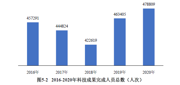 2020年登记的科技成果共涉及完成人478809人次,比上年增长3.32%。2016-2020年,科技成果完成人总人次呈现波动态势,2017年和2018年持续下降,2019年实现较快增长,2020年达到五年来最高水平(见图5-2)。