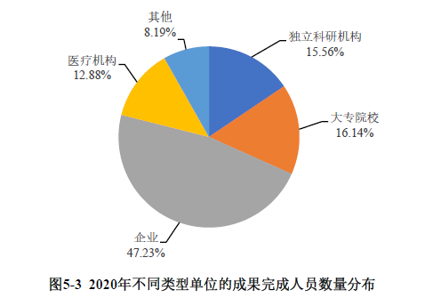 企业科技人员是科学技术研究开发的主体。从单位类型看,企业科技成果研究人员为226120人次,占总人次的47.23%;大专院校研究人员为77268人次,占比为16.14%;独立科研机构和医疗机构成果完成人员分别为74533人次和61677人次,分别占15.56%和12.88%(见图5-3)。