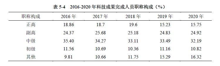 具有正高、副高、中级职称的研究人员保持较高比例。成果完成人中,具有正高、副高级技术职称的完成人共计194737人次(其中院士为1610人次),占总人次的40.67%;中级技术职称的研究人员154137人次,占32.19%。 2016-2020年,科技成果完成人员的职称构成变化不大,具备正高、副高、中级职称的科技成果完成人员占比略有下降,从2016年的78.63%下降到2020年的72.86%(见表5-4)。