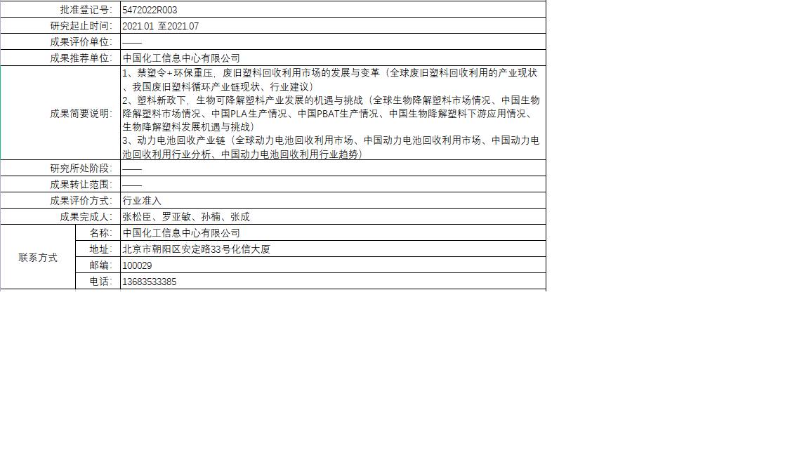根据中国中化控股有限责任公司科技成果登记管理办法,按照科技成果管理程序,现将中国中化控股有限责任公司登记的成果予以公告。对公告上登记的科技成果内容持有异议者,可与中国中化控股有限责任公司科技成果登记中心联系。其管理有效期(自公告之日起)为期7天。