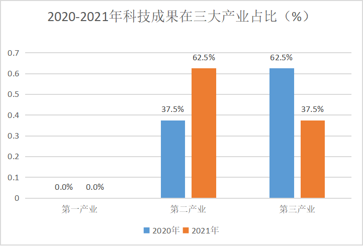 技术成果按应用行业进行分类统计,第一产业(即农、林、牧、渔业)为0,与上一年持平;第二产业(即采矿业,制造业,电力、热力、燃气及水的生产和供应业,建筑业)占62.5%,较上一年上升了25个百分点;第三产业(即除第一、二产业外的其他行业)的比例达到37.5%,较上一年下降了25个百分点。(见图2-2)
