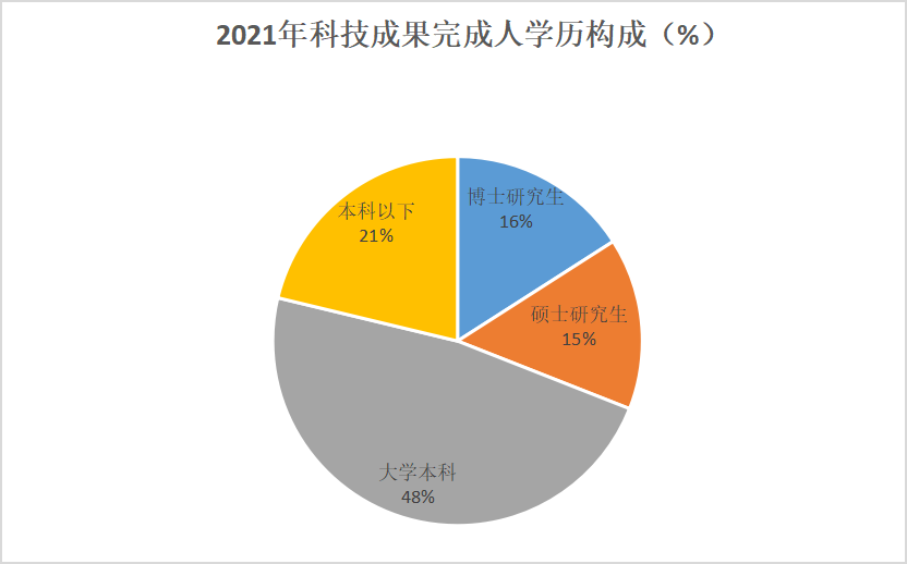 从学历构成看,2021年我中心登记的科技成果完成人员中,科技成果完成人中博士研究生为36人次,占全部人次的15.92%;硕士研究生为34人次,占15.04%;大学本科为108人次,占47.78%;本科以下学历人员48人次,占比21%。(见图5-2)