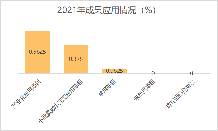 2021年度我中心登记的16项应用技术科技成果中,产业化应用的成果数达到9项,所占比例最高为56.25%,其中由企业完成的科技成果占88.88%;小批量或小范围应用的成果数6项,占全部应用技术成果的37.5%,小批量或小范围应用的成果全部由企业完成;试用成果数1项,占全部应用技术成果的6.25%,试用成果由企业完成;未应用的成果数0项。(见图6-1)