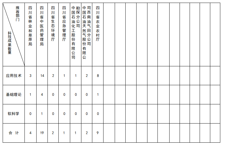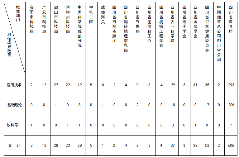 |       推荐部门           科技成果数量        | 四川省科学技术厅 | 成都市科技局 | 自贡市科技局 | 攀枝花市科技局 | 凉山州科技局 | 泸州市科技局 | 德阳市科技局 | 绵阳市科技局 | 广元市科技局 | 内江市科技局 | 遂宁市科技局 | 巴中市科技局 | 乐山市科技局 | 宜宾市科技局 | 南充市科技局 | 达州市科技局 | 雅安市科技局 | 甘孜州科技局 |