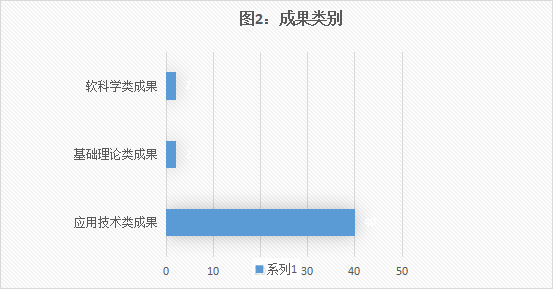 本年度新增应用技术类成果40项,基础理论类成果2项,软科学类成果2项(如图2所示),其中基础理论类成果和软科学类成果占新增总成果的比例由去年的各占1.14%提高到各占4.5%。