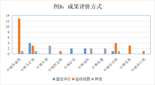 2021年中钢集团登记入库的科技成果,其评价方式以鉴定评价、验收结题、其他评价方式为主。其中,鉴定评价多为外部权威机构评价;验收结题一般是承担国家、省部级计划的课题组组织评价或本企业借助专家组评审组织评价;其他方式以外部机构评估、评价为主。各所属企业成果评价方式见下图3。