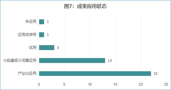 成果应用状态主要以产业化应用为主,产业化率高达62.5%。应用后停用的成果有1项,主要原因来自于市场因素;未应用的成果有1项,主要原因来自于管理因素。具体数据详见图7。