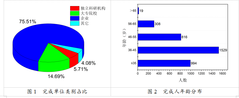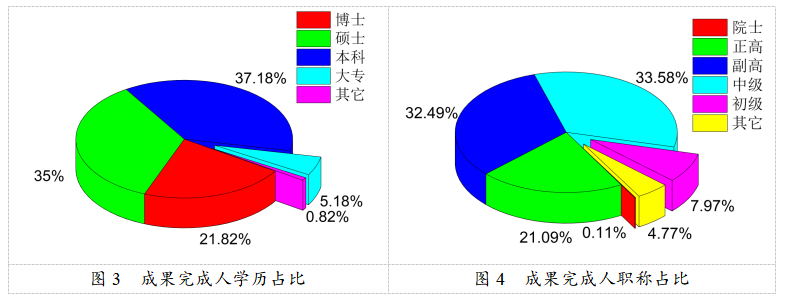 2020年登记的科技成果涉及完成人共3666人,平均每个项目有15人参与。如图2所示,36-45岁的中青年为主要科研力量,共1529人,占比总人数的41.71%;小于35岁(含35岁)的成果完成人为994人,占比总人数的27.11%;46-55岁的成果完成人为816人,占比总人数的22.26%。从学历构成看(图3),博士研究生、硕士研究生、本科和其他学历占比分别为21.82%、35.00%、37.18%和6.00%。从职称构成看(图4),高级职称人员占比完成人总数的53.68%,其中正高级人员(含院士4人)占比21.19%、副高级人员占比32.49%;中级从业科技人员占比完成人总数的33.58%,多数为35岁以下的青年科技人员。总体来看,成果研究人员本科及以上学历人员占比达94.00%,中高级职称人员占比成果完成人的87.26%,科研队伍结构日趋合理、科技支撑能力建设日益加强。