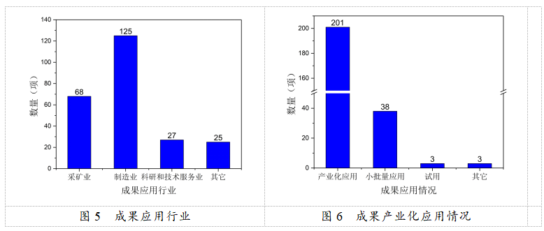 从成果应用行业来看(图5),主要应用于制造业,达125项,占比登记成果总数的51.02%;采矿业、科研和技术服务业分别为68项、27项,分别占比登记成果总数的27.76%、11.02%。2021年登记的科技成果中,成果处于初期阶段4项、中期阶段9项、成熟应用阶段232项,其中201项成果已产业化应用(图6),占比登记成果总量的82.04%,成熟阶段的项目大多投入产业化应用。