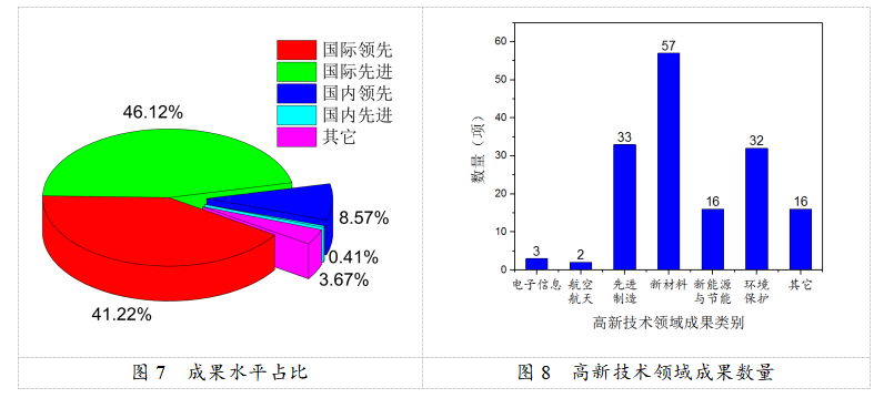 2021年登记的科技成果中,原始性创新205项,国外引进消化吸收创新12项,国内技术二次开发25项。从成果水平来看(图7),国际领先项目101项,占比登记总数的41.22%,国际先进项目113项,占比登记总数的46.12%,国际水平成果整体占比登记成果总数的八成以上。2020年登记的科技成果中,156个项目属于高新技术领域成果,其中新材料、先进制造、环境保护数量较多,分别为44项、32项、34项(图8)。