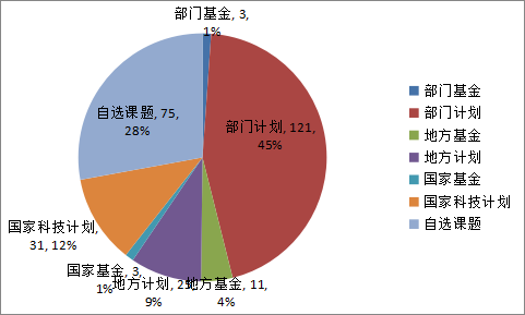 登记的269项科技成果中,国家科技计划31项,占全年总数11.52%;部门计划121项,占全年总数44.98%。地方计划25项,占全年总数9.29%;部门基金3项,占全年总数1.12%,地方基金11项,占全年总数4.09%。自选课题75项,占全年总数27.88%;因此,由国家市场监督管理总局设立的部门计划项目是主要的课题来源。