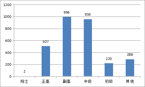 在登记人员职称构成方面,院士2人,占全部人员0.07%;正高级职称507人次,占全部人员17.06%;副高职称996人次,占全部人员33.51%;中级职称959人次,占全部人员的32.27%;初级职称220人次,占全部人员的7.40%;其他人员288人次,占全部人员的9.69。从职称构成上看,独立科研机构高级、副高级、中级人员是科研的中坚力量。