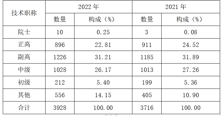 从职称构成看,具备正高、副高级、中级职称的研究人员保持较高的比例。2022年正高级职称为896人次,占22.81%,副高级职称为1226人次,占31.21%;中级职称为1028人次,占26.17%。(见表6)。