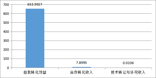 在本年度登记的应用技术成果中,已进行产业化应用的共有163项。其中产生了经济效益项目共有134项,占产业化应用成果数的82.21%。在自我转化效益方面,收入为653.99亿元,创造净利润53.79亿元,实交税金13.41亿元,出口创汇43.02亿元,节约资金8.05亿元。在合作转化方面,收入为7.8995亿元,其中技术转让收入65万元。技术许可收入206.00万元,其中知识产权技术转让收入206万元。