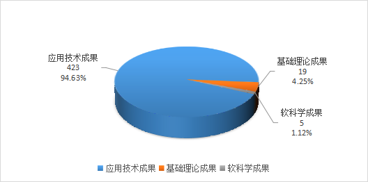 在所登记的447项科技成果中,应用技术成果423项,占成果登记总数的94.63%;基础理论成果19项,占成果登记总数的4.25%;软科学成果5项,占成果登记总数的1.12%。在登记的成果中仍然以应用技术成果为主。