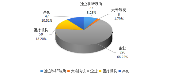 在所登记的447项科技成果中,按第一完成单位统计,独立科研院所37项,占全省科技成果登记总数的8.28%;大专院校8项,占全省科技成果登记总数的1.79%;企业296项,占全省科技成果登记总数的66.22%;医疗机构59项,占全省科技成果登记总数的13.20%;其他47项,占全省科技成果登记总数的10.51%。企业获得成果所占比例最高。