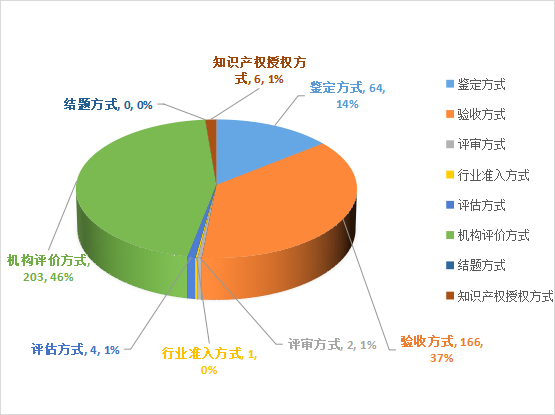 在所登记的447项科技成果中,鉴定方式64项,占成果登记总数的14.32%;验收方式166项,占成果登记总数的37.14%;评审方式2项,占成果登记总数的0.45%;行业准入方式1项,占成果登记总数的0.22%;评估方式4项,占成果登记总数的0.89%;机构评价方式203项,占成果登记总数的45.41%;结题方式0项,占成果登记总数的0.00%;知识产权授权方式6项,占成果登记总数的1.34%。其他项目数1项,占成果登记总数的0.22%本年度年成果评价方式主要以机构评价方式为主。