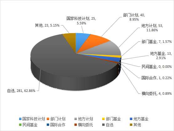 在所登记的447项科技成果中,各级政府计划和基金项目产生的成果138项,占登记成果总数的30.87%。其中国家科技计划25项,部门计划40项,地方计划53项,部门基金7项,地方基金13项。其他来源科技项目产生的成果309项,占登记成果总数的69.13%。其中民间基金0项,国际合作1项,横向委托4项,自选281项,其他23项。