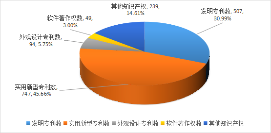 在所登记的447项科技成果中共拥有知识产权1636件,其中发明专利数507件,占比30.99%;实用新型专利数747件,占比45.66%;外观设计专利数94件,占比5.75%;软件著作权数49件,占比3.00%;其他知识产权239件,占比14.61%。已授权专利数1197件。