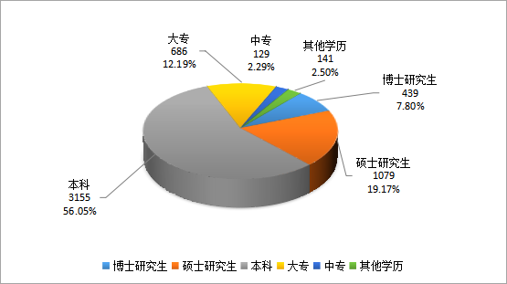 在所登记的447项科技成果中,按科技成果完成人员文化程度统计:博士研究生439人,硕士研究生1079人,本科3155人,大专686人,中专129人,其他学历141人,成果完成人员学历普遍较高,博士研究生和硕士研究生共计1518人,占完成人员总数的26.97%,本科占56.05%。