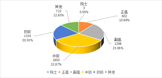 在所登记的447项科技成果中,按科技成果完成人员职称统计:院士3人,占0.05%;正高602人,占10.69%;副高1298人,占23.06%;中级1850人,占32.87%;初级1154人,占20.50%;其他722人,占12.83%。从技术职称分布看,具备正高、副高、中级职称的研究人员占比达66.67%。