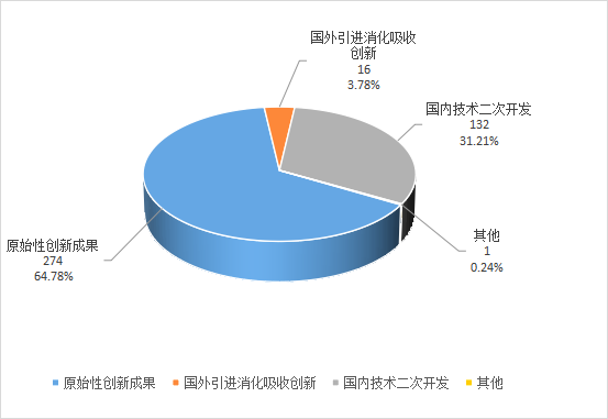 在所登记的423项应用技术成果中,原始性创新成果274项,占64.78%;国外引进消化吸收创新16项,占3.78%;国内技术二次开发132项,占31.21%;其他1项,占0.24%。应用技术成果中仍以原始性创新成果为主。