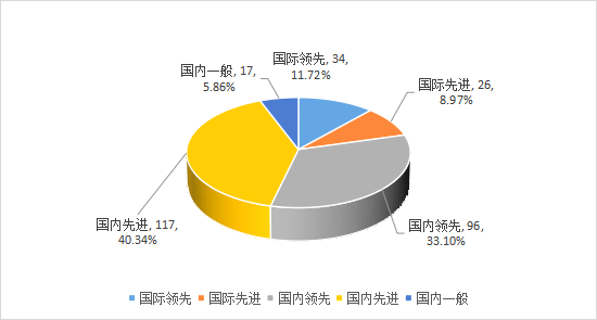 在所登记的423项应用技术成果中,共有290项成果进行了成果水平评价,占比为64.88%。其中,国际领先34项,占11.72%;国际先进26项,占8.97%;国内领先96项,占33.10%;国内先进117项,占40.34%;国内一般17项,占5.86%。未评价133项,占31.44%;
