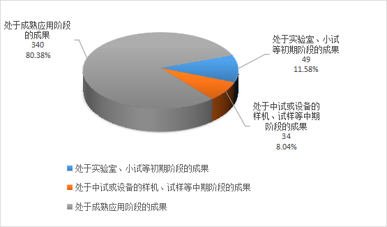 在所登记的423项应用技术成果中,处于处于实验室、小试等初期阶段的成果49项,占11.58%;处于中试或设备的样机、试样等中期阶段的成果34项,占8.04%;处于成熟应用阶段的成果340项,占80.38%。