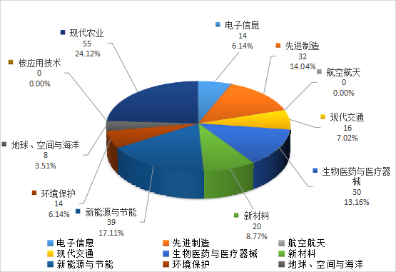 在所登记的423项应用技术成果中,属于高新技术领域的228项,占应用技术成果的53.90%。其中电子信息14项,先进制造32项,航空航天0项,现代交通16项,生物医药与医疗器械30项,新材料20项,新能源与节能39项,环境保护14项,地球、空间与海洋8项,核应用技术0项,现代农业55项。