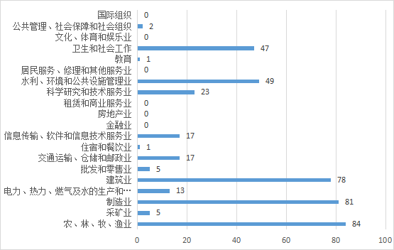 按技术成果实际推广应用的行业分类进行统计,农、林、牧、渔业84项,采矿业5项,制造业81项,电力、热力、燃气及水的生产和供应13项,建筑业78项,批发和零售业5项,交通运输、仓储和邮政业17项,住宿和餐饮业1项,信息传输、软件和信息技术服务业17项,金融业0项,房地产业0项,租赁和商业服务业0项,科学研究和技术服务业23项,水利、环境和公共设施管理业49项,居民服务、修理和其他服务业0项,教育1项,卫生和社会工作47项,文化、体育和娱乐业0项,公共管理、社会保障和社会组织2项,国际组织0项。